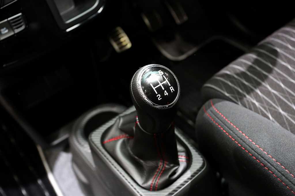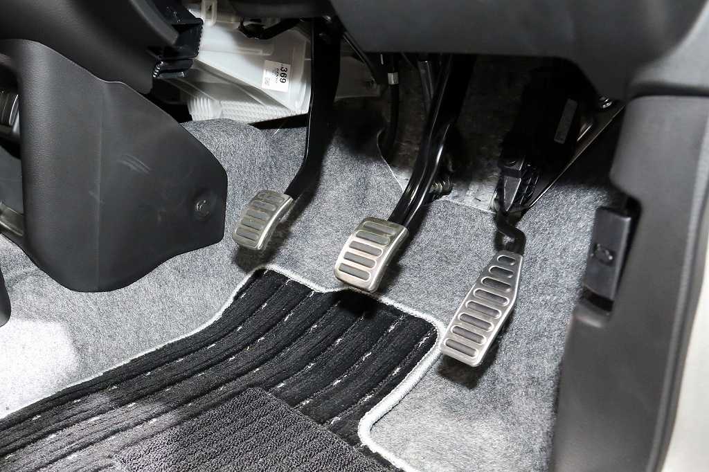 そしてシフトノブは5速パターン入り。解説によるとシフトストロークはスポーティなフィーリングを求めてショートストロークになっているという。足下を見るとスポーティなデザインの3ペダルが採用されている。シートに座って各ペダルを操作してみたが、配置は自然。スムーズに操作ができる間隔になっていた。
