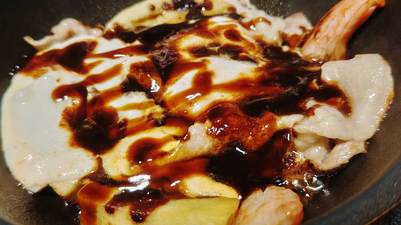 高野豆腐をオリーブオイルで焼いて、カニカマと、豚バラ肉焼いて