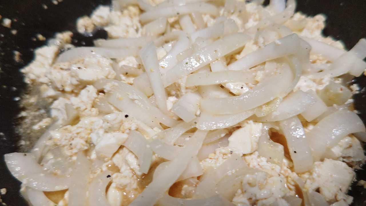 豆腐と玉ねぎを、ごま油と、ほりにしスパイスで炒めて、玉子も入れて炒めていただきました