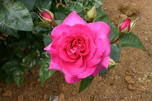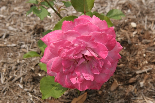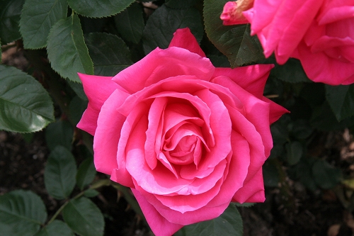 マヌウ・メイアン HT、1979年作出国フランス・メイアン。 濃いウオ ーム・ピンクのバラで、丸弁に近い半剣弁咲き、花 径は11cm位。 小ぶりの株で、育て易い。 華やかな色合いであるが、目を射るような押しつけ がましさが無いのがいい。 房咲き性。 すぐれた 品種である。マヌウ・メイアンへジャンプ