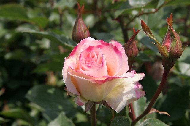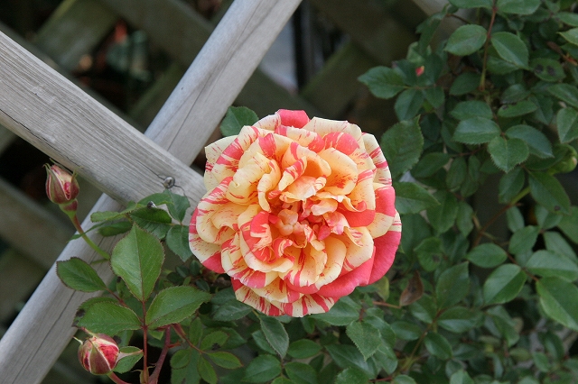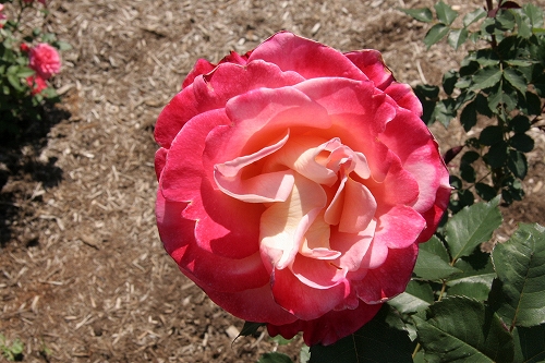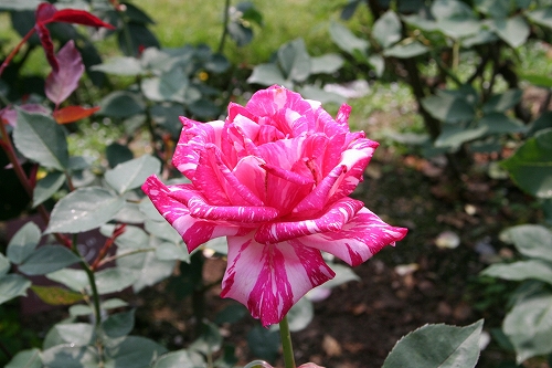モダンタイムズ HT、1956年作出、オランダ。 花色は濃いピンクに白のスト ライプが入って、何とも華やかな雰囲気をもっている。 半剣弁 高芯咲き、中~大輪、四季咲き性、微香。 樹高は1m、株立ち性。 樹形がコンパクトなので、鉢植えでも 育てられる。 花の名は、チャップリンの「モダンタイムス」をイメージしたもの かどうかは、分からない。モダン・タイムズへジャンプ
