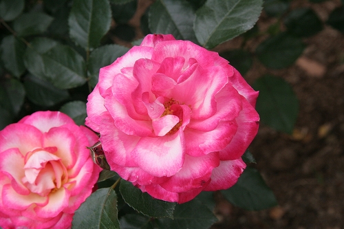 ミュージック FL、1984年作出、日本・浅見均。 花色は花弁の 内側が白で、縁が濃いピンクのツートン。 丸弁高芯咲 き、中輪、房咲き性、四季咲き性。ミュージックへジャンプ