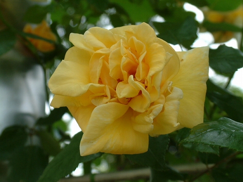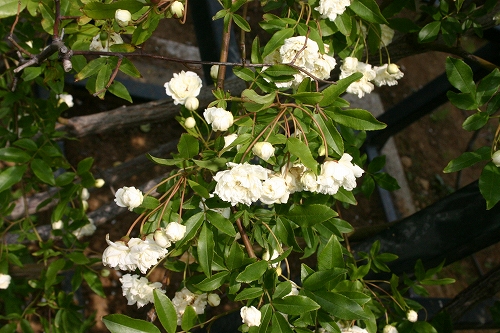 モッコウバラ 原産地は中国である。 6~7mにも伸びる蔓性植物で、 白又は淡黄の八重咲きの小さな花を咲かせるバラの仲 間である。 花の大きさは、径2~3cm程度で、枝は細く 緑色で、トゲはない。 白花には香りがあるが、黄花には 香りはない。 病気には、殆どかからない強健種。 中国には原種である花弁が5枚のものがあり、これにはとげ がある。 八重のものは、これから改良された園芸種とされ ている。 江戸時代に日本に伝えられた。 モッコウバラへジャンプ