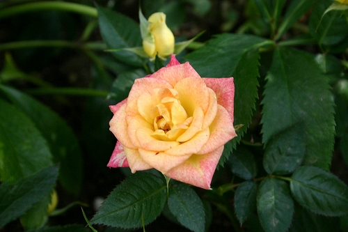 メリーラン MINI、作出年、作出国ともに?。 花色は蕾の うちは、黄色にうっすらと赤がにじむ程度であるが、 花びらが開くと、縁が赤色に染まっていく。 その グラデーションが素晴らしい。 半剣弁高芯咲き、花径は4~5cmあり、ミニとし ては大きい。 メリー(楽しさ)がラン(続く)ように、というの が名前の由来とか。 メリーランへジャンプ