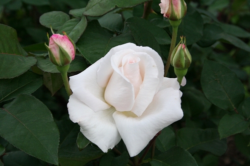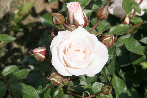 ミス・ヒロシマ HT、作出年?、広島バラ園。 花色は白で、中央部が 淡いピンク。 丸弁高芯咲き、中輪、四季咲き性。ミス・ヒロシマへジャンプ