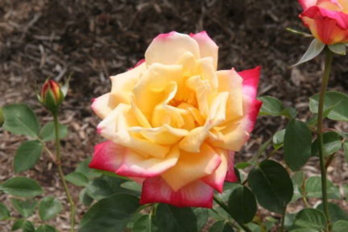 3月26日(水)・名古屋 晴れ・12℃~23℃アンネのバラ 正式名称は、「スーヴニール・ド・アンネフランク」である。 ベル ギーのバラ育種家・デルフォルゲ氏により、1960年に作出された。 FL(フロリバンダローズ)で、HT(ハイブリッド・ティー・ロー ズ)よりコンパクトに育ち、花の量も多く咲く。半八重盃状咲き、中 輪、四季咲き性。 丈夫で育てやすい。 このバラは、蕾から開花直後は、濃いオレンジ色に縁が赤い覆輪であ るが、暫くすると全体が赤っぽく変化する。 アンネがバラが好きだったということで、ベルギーの園芸家が「スー ブニール・ド・ アンネフランク」(「アンネの形見」)という名前 で発表し、1962年にアンネのお父さん オットー・フランク氏に贈ら れた。 オットー・フランク氏が、日本でも 「アンネの日記」が広く読まれ ていることを知り、1972年に10株ほどを日本へ贈られ、その挿し木が 全国へ広がっている。 「アンネのバラ基金」を活用して、このバラを全国の小中高校、公 的施設に配布して、平和を愛する心を広める事業が行われている。 このバラだけでは、多少地味なので、巨大輪の「ラブ・アンド・ピー ス」、または「ピース」の苗も同時に配布している。 この事業が、 広く全国的に展開することを切に願っている一人である。