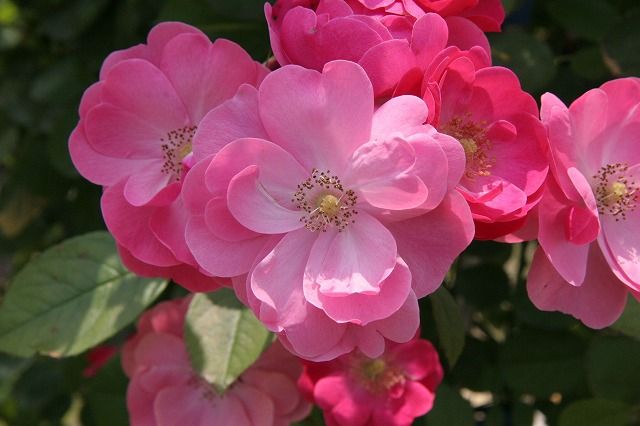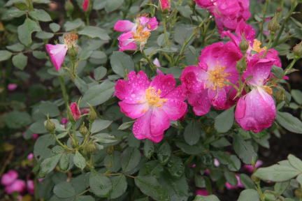 3月29日(土)・名古屋 雨後曇り・8℃~16℃アンジェラ CL(つるバラ)、1988年作出、ドイツ・コルデス。ピンクの 盃状咲きの花を沢山咲かせる。花径4~5cmで小輪、花弁数15 ~16枚。とても花付きの良い品種で、花盛りの時は、株全体を花 が覆う。つるバラとしては、四季咲き性があり、初夏に沢山花を咲 かせた後も、少しづつではあるが、秋まで花を咲かせ続ける、微香。 樹高3~4m、誘引しやすい丈夫な人気品種。 冬剪定で短く切り つめると、木バラのように咲かせることも出来る。 アンジェラはエンジェル(天使)からきた女性名。