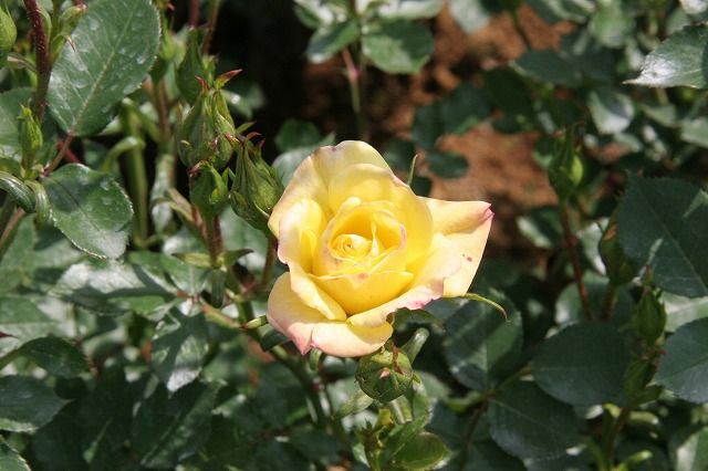3月 4日(火)・名古屋 雨時々曇り・5℃~7℃エイコウ(栄光) HT、1979年作出、京成バラ園(鈴木省三氏)。花色 は黄色で、開花に従って花弁の先から紅色がのってきて、 何とも素敵な色 合いとなる。 剣弁高芯咲き、花弁数は 30~35枚で、花径は13~15cmと大輪。 四季咲 き性、多花性、微香。 樹高1.1~1.3m、樹形は直立性で、まとまりの良い 株立ちである。 茎は明緑色で、基部が広く短く、下向き のトゲが少しある。 芽出しは青銅色で、成葉は明緑色か ら緑色の半光沢葉小花柄にわずかに毛がある。 このバラは色変わりするさまが美しく、花数が多い早咲き 種で、庭植え・鉢植え向き。