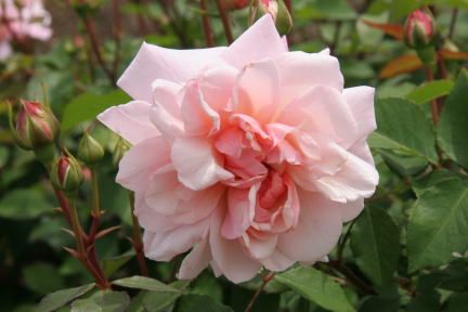 3月27日(木)・名古屋 晴れ後雨・9℃~21℃アンヌ・ボレイン En.R、1999年作出、イギリス・オースチン。 花色は暖かい ソフトピンクで、中輪、ロゼット咲き、四季咲き性、軽い香り。 樹形は可成り低く広がる。 大きなスプレー状に咲き、めざましい開 花連続性を持っている。 ソフトグリーンの大きな照り葉に、軽い香 りが楽しめる。 命名の由来はよく分からないが、多分ヘンリー8世の2番目の王妃アン (ヌ)・ボレイン(ボーリン)ではないかと思う。アン・ボレインは、 エリザベス1世を生んだが、王子を望んでいた王にはそれは不満だっ た。やがて、心移りした王は、彼女に不倫の濡れぎぬを着せ、ロンド ン塔に送ったのである。彼女は、反逆罪の汚名を着せられた上、1536 年、ベル塔の地下室で首を斬られて殺された。この世に恨みを残した アン・ボレインの魂が、亡霊となって、今なお、霧深いロンドン塔に さまよっているとか。