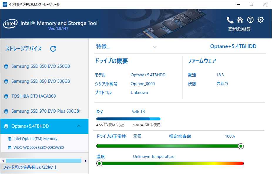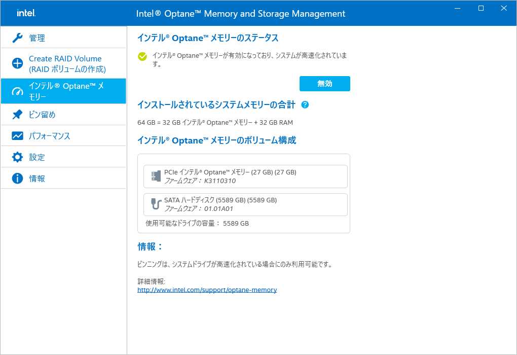 二回目のリフレッシュは、慣れていることもあり、半日ほどで終了しました。今度は初めから Optane Memory and Storage Management をインストールしました。不確かな記憶なのですが、Rapid Storage Technology のアンインストール後にインストールした Optane Memory and Storage Management の操作画面と二回目のリフレッシュ時に初めからインストールした Optane Memory and Storage Management の操作画面が異なっているような気がします。