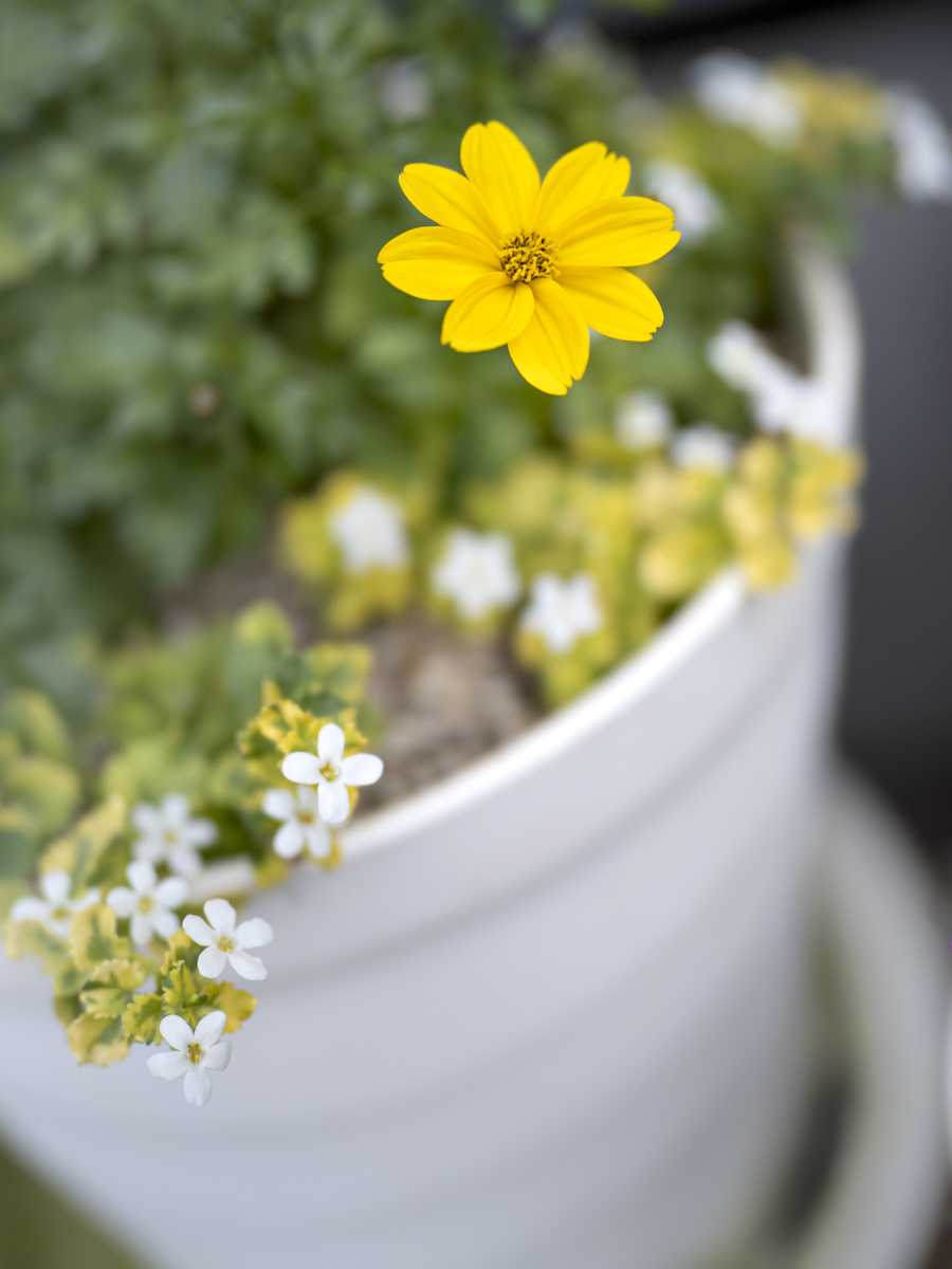 ビデンスの花の黄色とバコパの葉の黄緑色、花の形がマッチしていると思う。撮影した今日は曇り空だったので柔らかな感じの写真になった。ビデンスもバコパの生長も良い。
