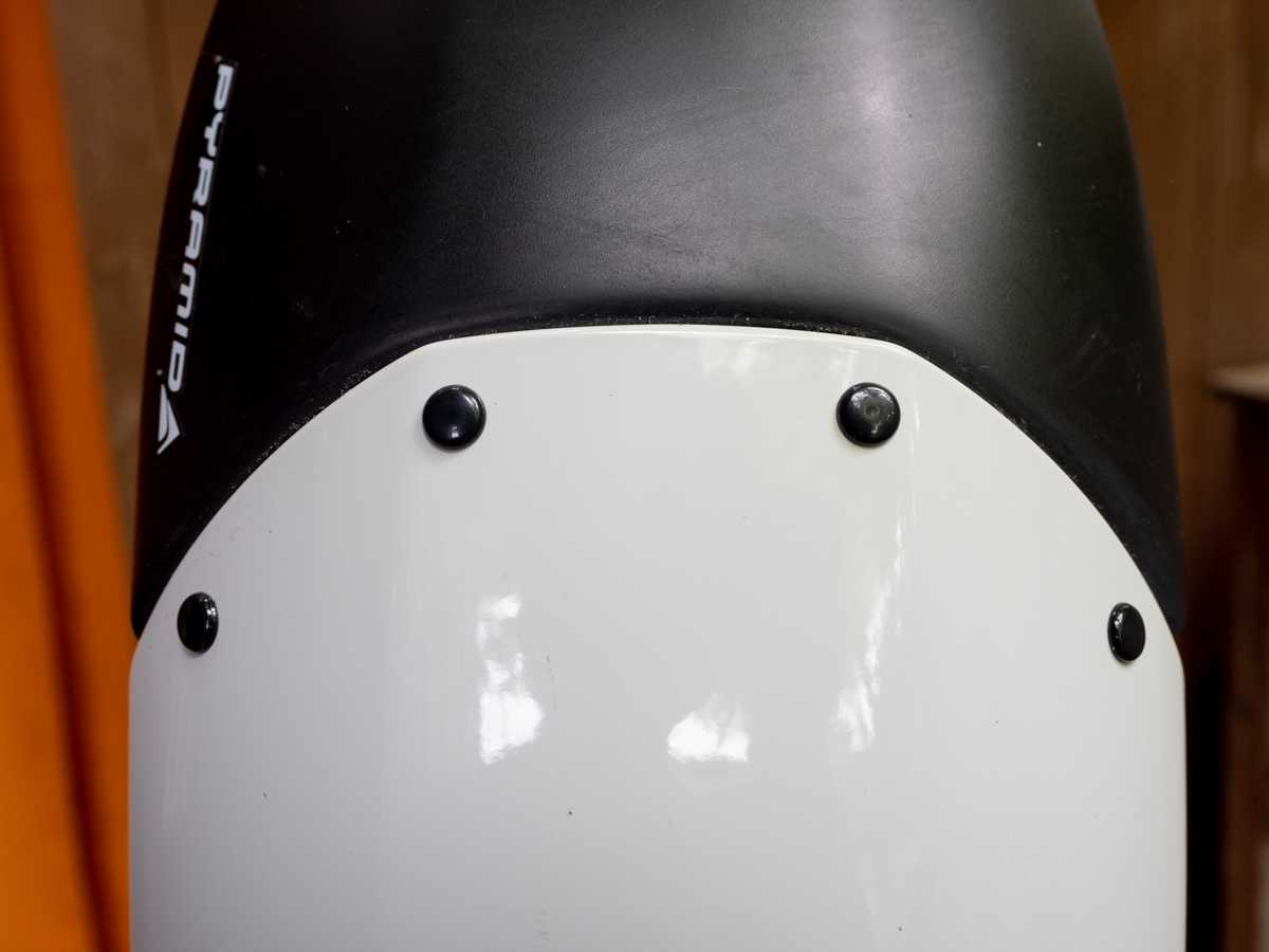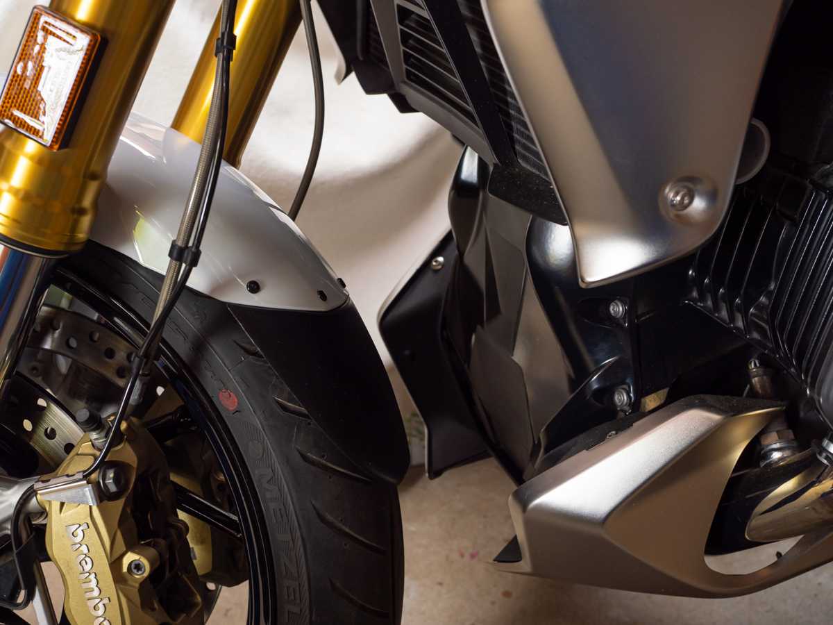 R1250Rのフロントフェンダーに両面テープのみで取り付けたフェンダー・エクステンダーだが、紛失していた付属のプラスチック・リベットを見つけたので、取り付け直すことにした。