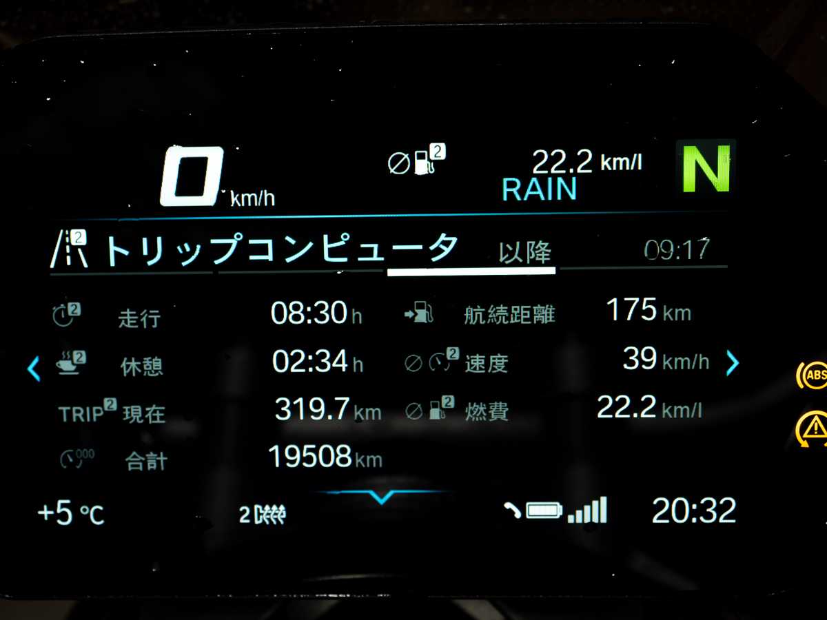 走行は8時間30分、休憩は2時間34分、燃費は22.2km毎リットルだった。走行距離は320kmだから大したことはない。