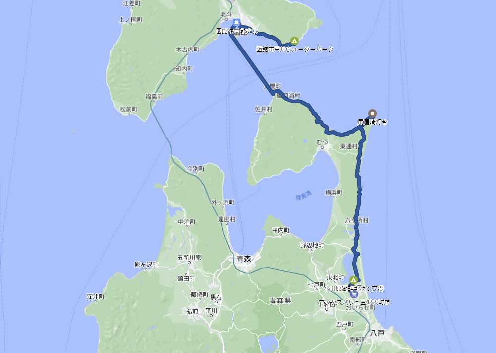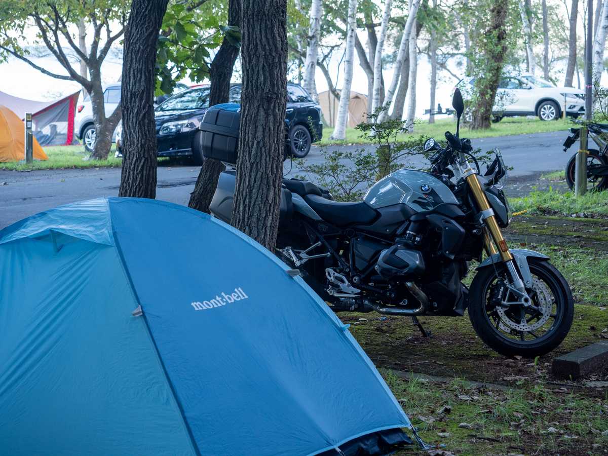 小川原湖畔キャンプ場」に到着。隣には先客のライダーの集団がいる。 ​​​