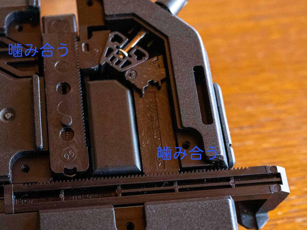 ノブを回すことで台形のパーツが二つの歯の付いたパーツを押し、歯が噛み合うことでそれぞれのアームが固定される。
