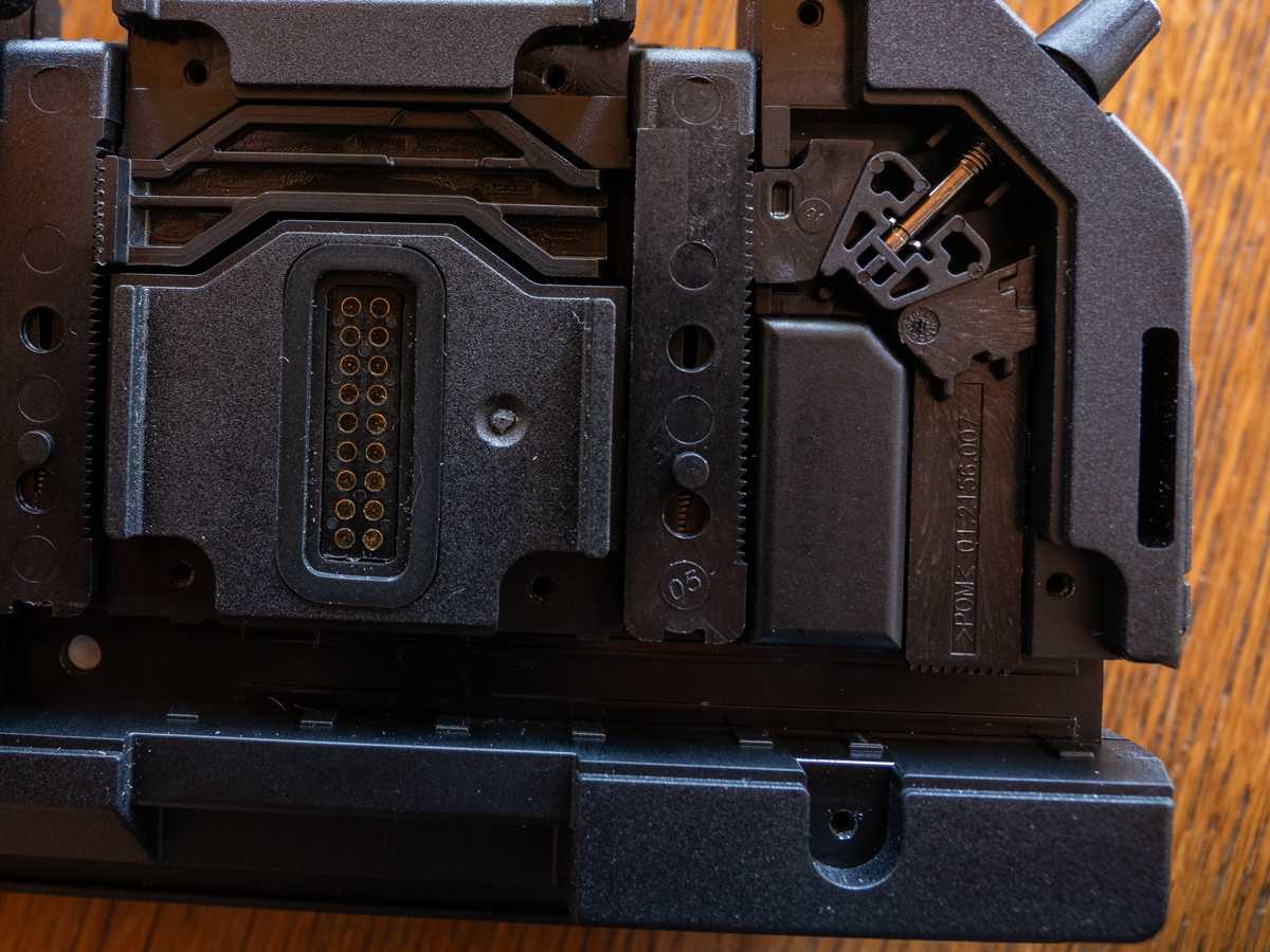 クレイドルの背面の小さなトルクスのボルトをすべて外し、裏蓋を取り外すと、アームを固定する仕組みがわかる。