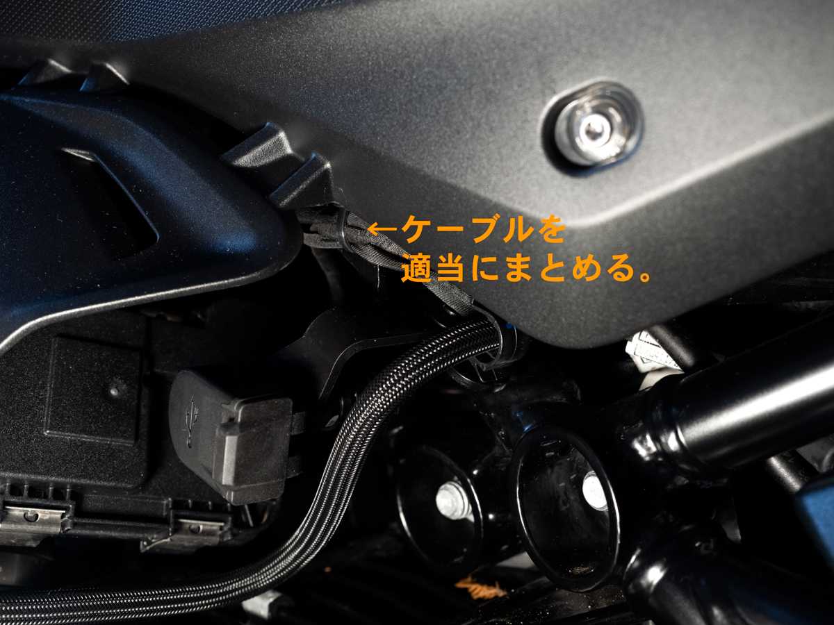 リアシート下の新たな USBソケット に挿した USBケーブル を外に這わせ、リアシートを取り付けても、USBケーブル はリアシートとバイク本体に挟まれることはない。リアシートを取り付けた状態でも、USBケーブル を動かすことができるので、ケーブルが強く圧迫されていないことがわかる。