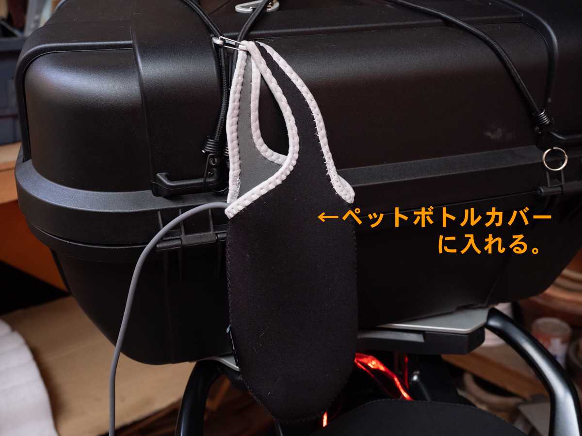 トップケースにはフックを引っ掛けるループが付いているので、そこにペットボトルカバーを吊るすことで落ち着いた。