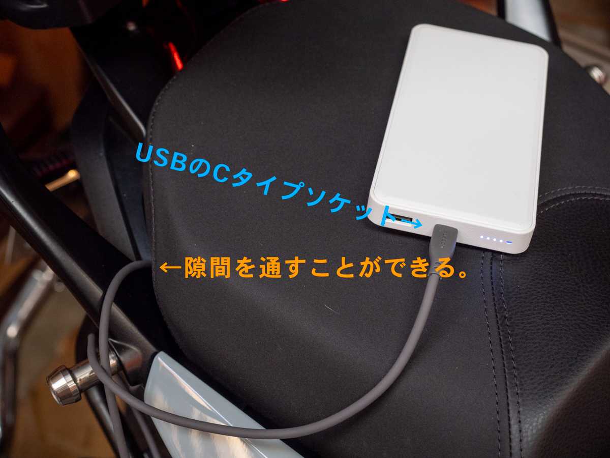 最終的に選んだ方法は、何らかの方法で、リアシートの上かトップケースの外側にモバイルバッテリーを置くというものである。もうこの時点で、見た目は悪くなってしまう。