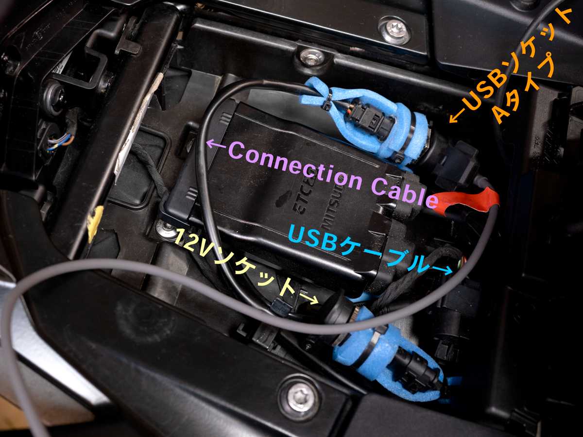 既設のUSBソケットからケーブルを外し、Connection Cable をそのケーブルにつなぎ、短い方を既設のUSBソケットに挿し込み、長い方をリアシート下までうまく引っ張ってくればいい。そこに新たに用意した USBソケット を挿し込むだけである。
