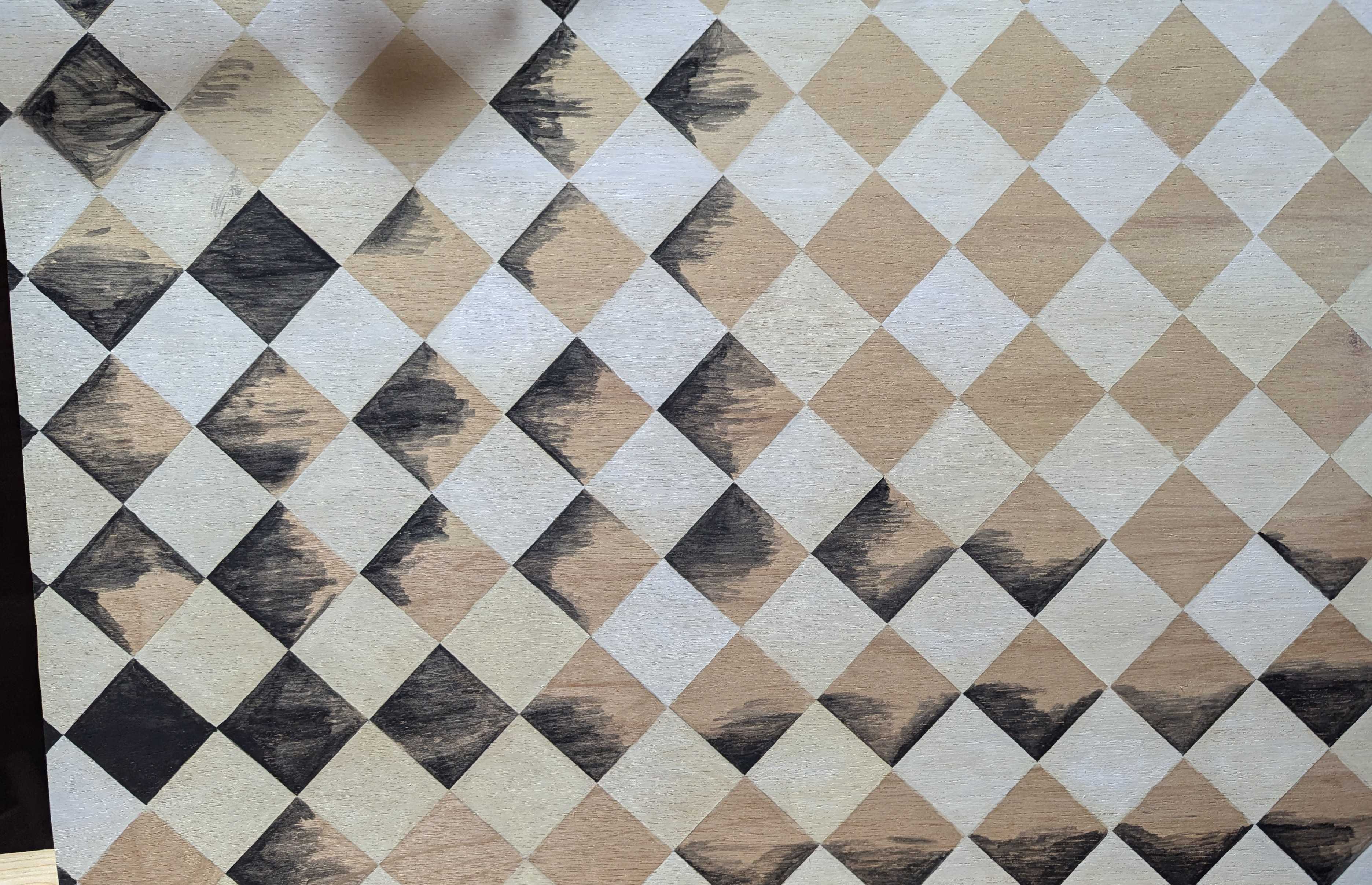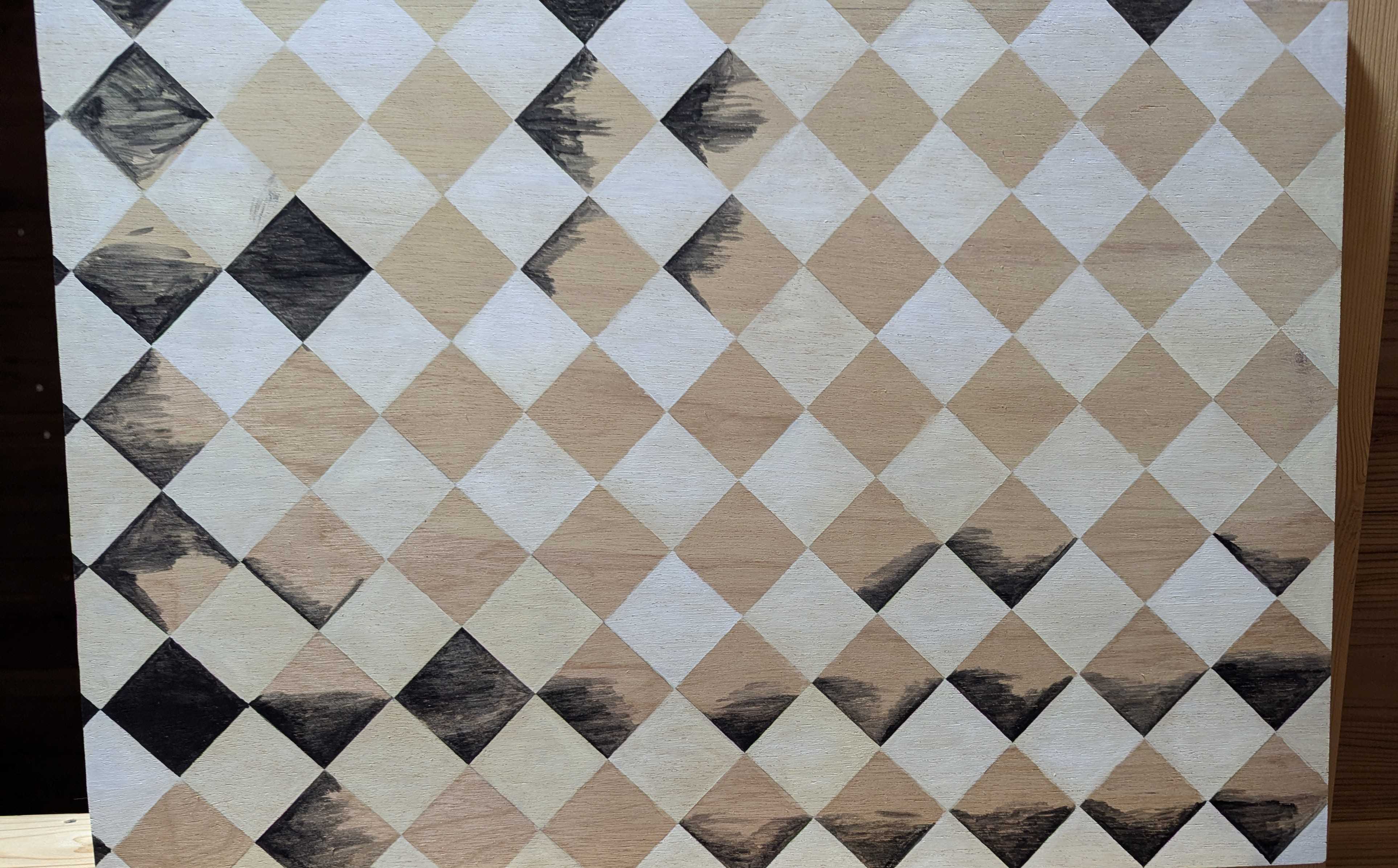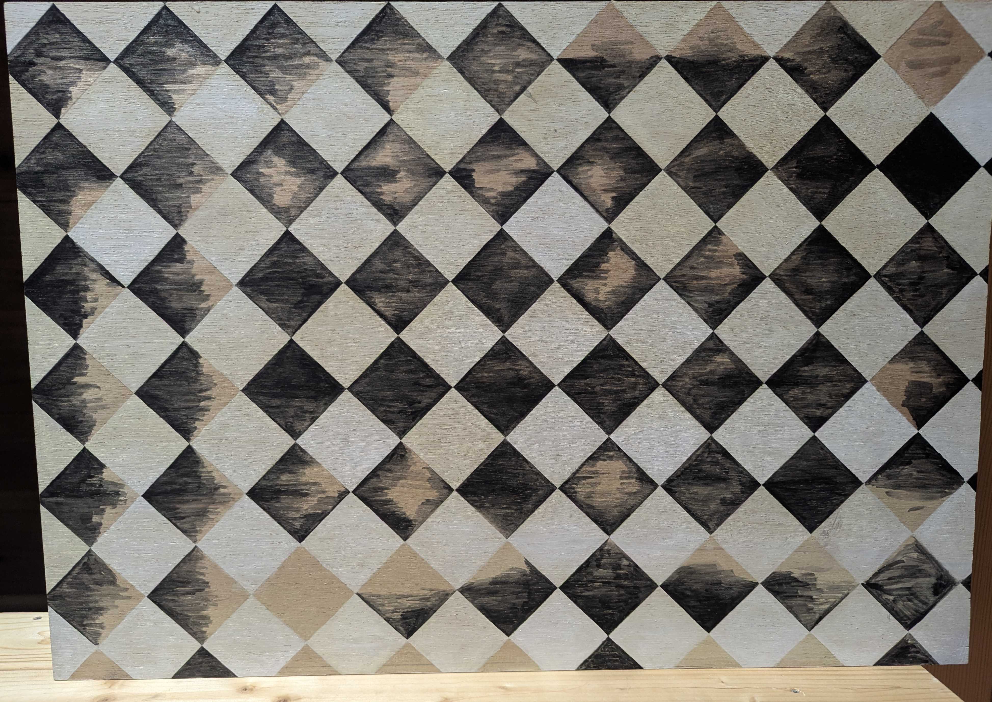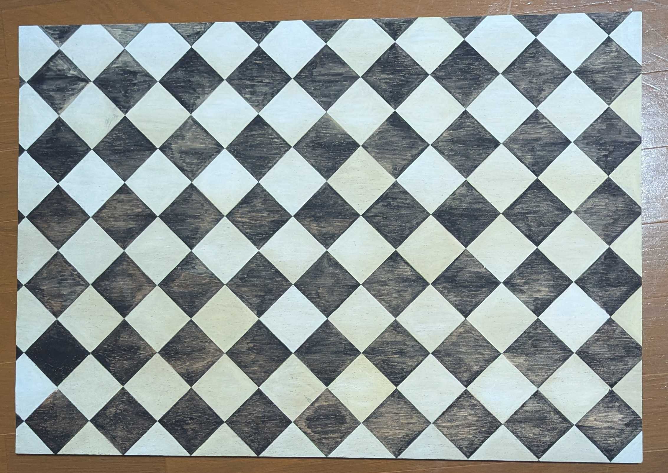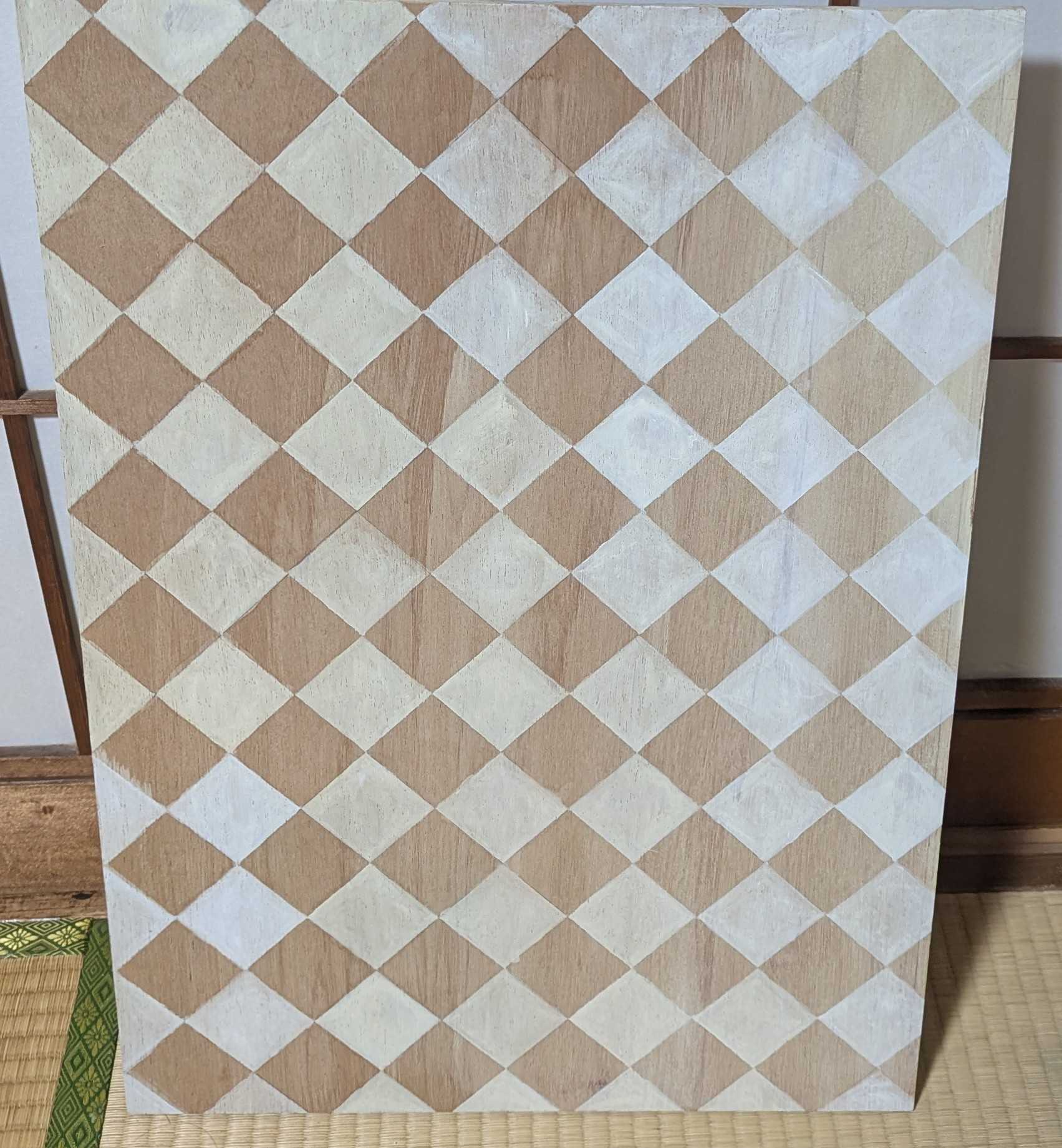 床部分、つまり厚みのある板を買ってきた。9×450×900これを640くらいにカットをして、格子模様を更に細かくした。しかしカット(のこぎり)久しぶりすぎて1回でピッタリとは行かずムカッ腹。ヤスリで微調整したけどおのれ。随分昔から白黒チェッカー柄の床に憧れがある。ドラクエのせいな気がする。
