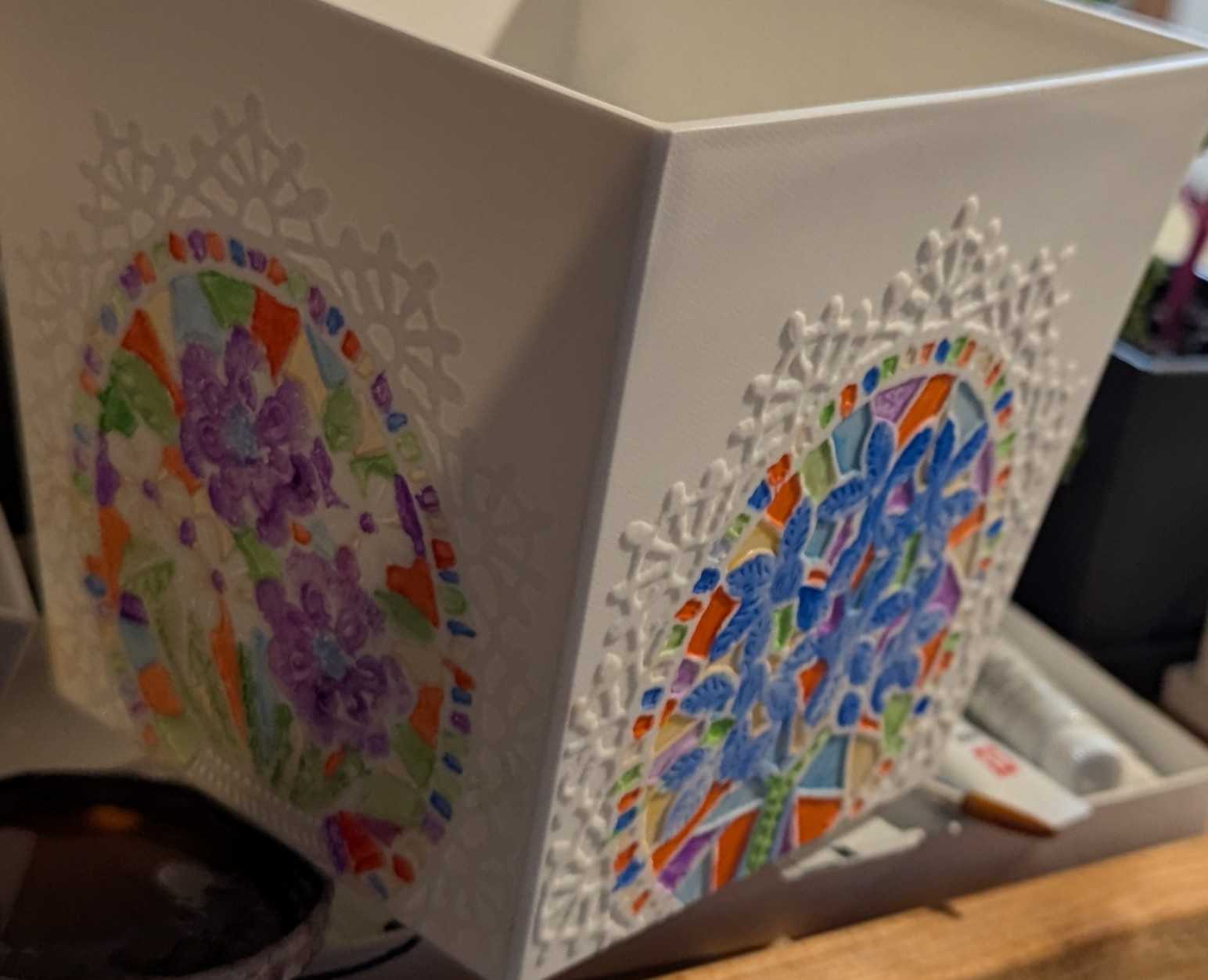 鉢候補の彩色を終える予定でしたが一つも終わりませんでした。此処から上に黒を塗って金で仕上げる予定。全体的なことで一つ決定したことは、温室の屋根部分に床で使うハズの金網をかけること。(床は板をかけるので使わない)微妙にサイズが合わないのはペンチでどうにかするつもりが、なんか良い感じに出来なそうなので最終的にタイラップで締めようと思います。この鉢も終わらなかった。青入れまでしたかった。というかこのコはこの温室の正規メンバーではない。
