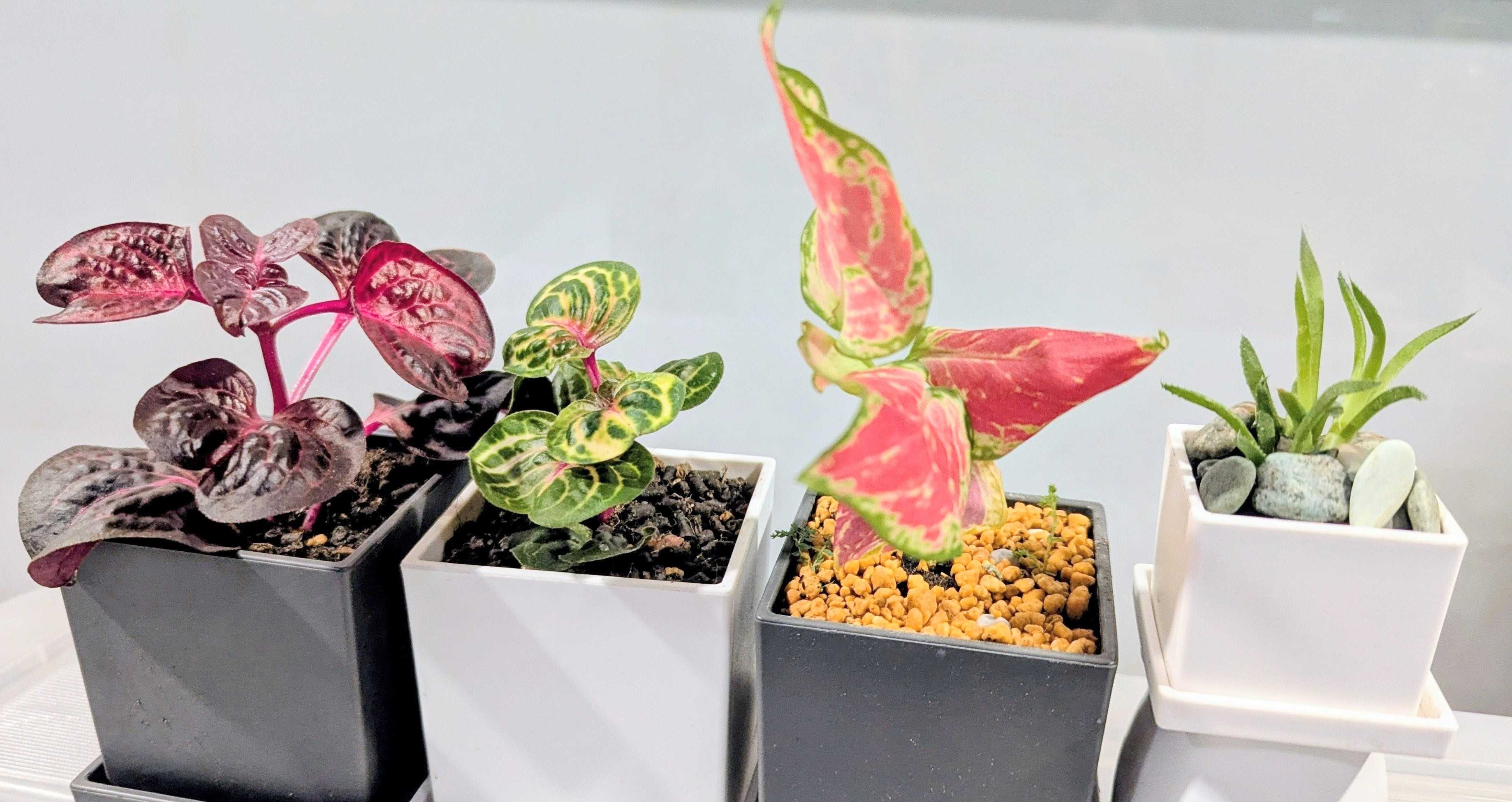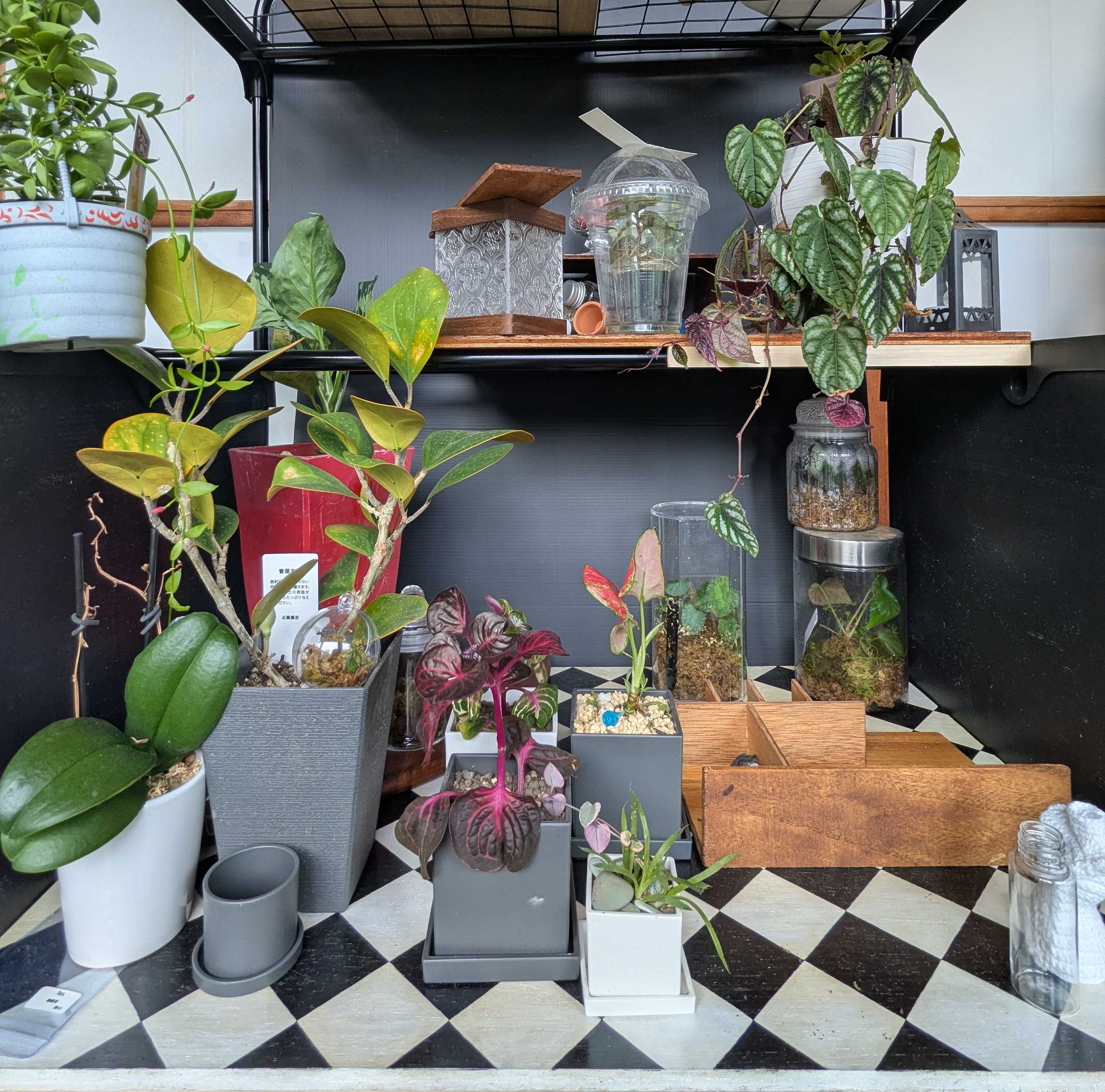 結局本体(温室)届くより先に資材材料達が届いた。木材に塗料、紙ヤスリ。まあこれは追々、加工を始めてから詳しく書きたいです。時に百円均一、スゴいですよねーいいですよねー。特にDAISOが好きです、あと中々近くにないけどSeriaいいですよね。色々、スゴい企業努力だと思うよ。つまり(?)温室サイズ感を数値でしかわからないのに先走って色々買ってしまったのですよ。最終的に鉢は手作りするつもりでいるのだけれども、植物手に入れたら植える先が必要な訳で。お誂え向きなのに出会ってしまった故買い込んでしまった次第です、はい。角型のミニポット受け皿付き。植わっているのは、DAISOで萎びていた、300円アグラオネマを救助したもの。(右黒)あとは私の好きなイレシネ。(左白黒)強くて増えて素直ないい子。一番右の更に小さいのはなんかホームセンターに500円で売ってた謎ハオルチア。乗ってる石は海で拾ってきた緑系の石。その他諸々植物を色々楽天してしまった……諭吉が何枚飛んだか、いや今諭吉じゃあないんだったっけ?