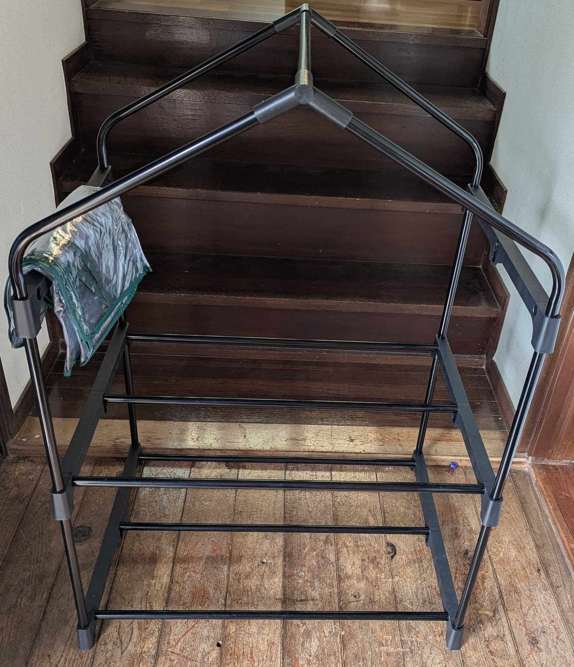 そしてやっと届いた温室!なんか再配達してくれた人が別の人だったらしく、「置き配可にしてくれてたのに、アイツもって帰ってきちゃったみたいですみませんー」って言っててさ、そういえばそうだよな、自分楽天は置き配可にしてるものな。まあ、いえいえこっちこそすみませんーってお帰り頂いたんだけれんども。いや不在票を隣の家に投函していたほうが問題では?置き配だったらそっちにおかれていたのでは。そんなことはどうでもいいとして、だ。なんかこう多いと慣れたし。早速!組み立てるッ!!朝飯前。……なんかデカいな……想定より、デカい。だがそれでいい。大は小を兼ねる。うん。いい感じいい感じいい感じッ!いや日当たり具合とか考えて棒の位置はズラすかもだが。置く予定の場所に持ってきた。やはりデカいがまあ、此処に床になる板材敷いて、描いて、2階も敷いて描いて。植物入れて小物作って照明入れちゃったりなんかしてェーーーーーーーーああああああ考えてるだけで楽しいッ!!!!……寧ろ今が一番楽しいのかも知れない。過言か、でも考えるのめっちゃ好き。白黒チェッカー柄の派手な床と、木の渋い床と、にするんだ!しかし想定はこの3/2くらいのサイズ感だったんだが。いつもの緑の二段のヤツだろって確認しなかった自分が悪い、というか大きいことは良いことだ。幅70×奥行き49×高さ95……ほんとか?実はもっとないか君???←