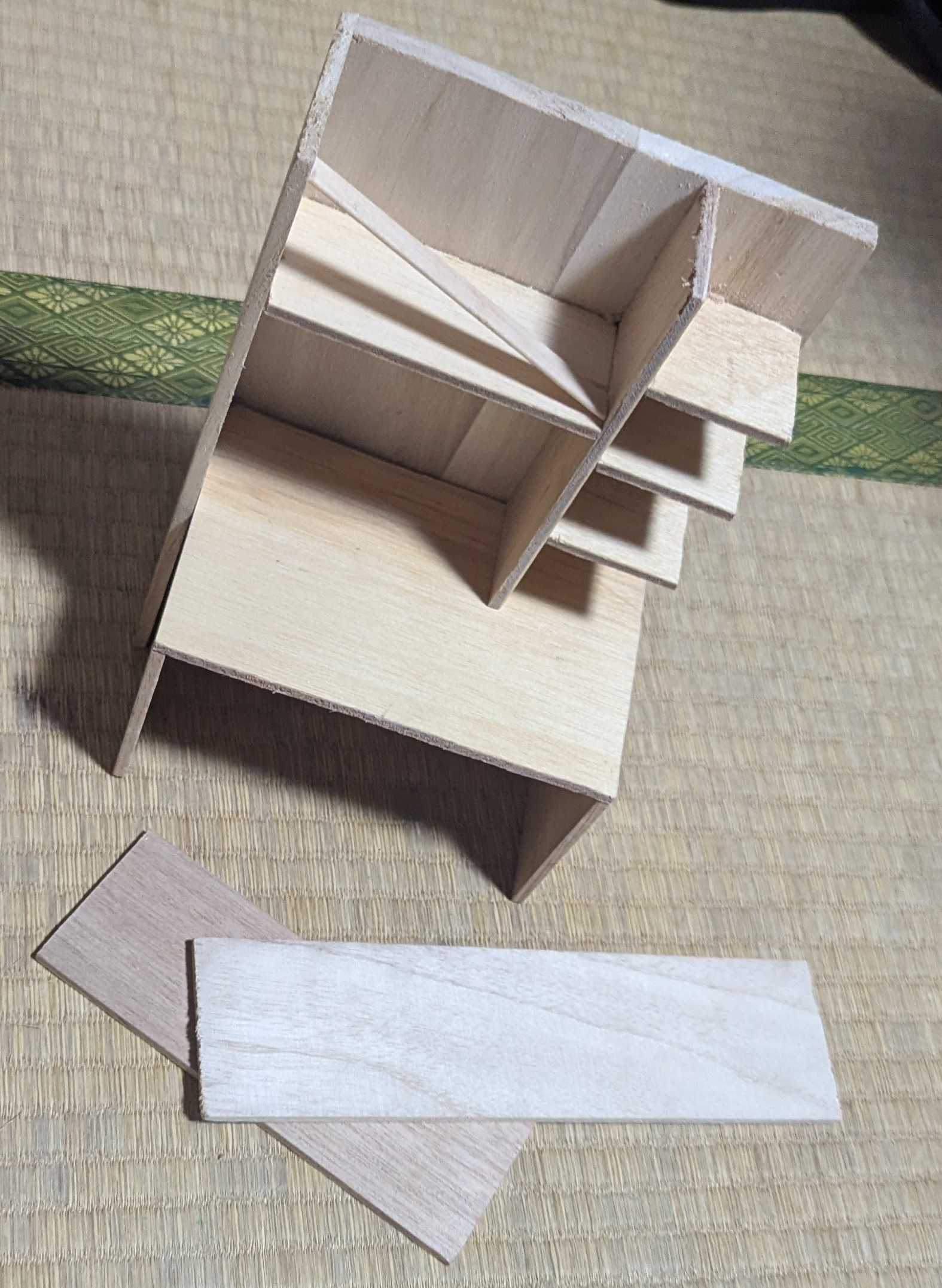 ベニヤを切りきり組みたてて、とりまここまで接着完了。こんな感じにするつもりだったが上閉じなくてもいいかなと思い始めた。またしても適当に並べただけだがなんかいい感じがする。しかしやはり棚がデカすぎた気もする。いやデカい。いやいや実用性考えたらこれくらいは欲しい、しなァ?あと1個作る予定なのだけれど、どうしようか。まあそれよかなにより塗装が先だ。