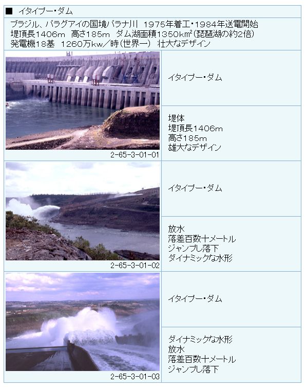ブラジルが誇る世界第二位の水力発電所。アマゾン川にはダムはありませんでした(笑)パラグアイとの国境パラナ川にありました。発電量は発電機18機 1260万KW/h。中国の三峡ダム水力発電所は、70万kW発電機26台を設置し、1,820万kWの発電が可能。らしい。中国は無理やり世界一を狙ったようである。