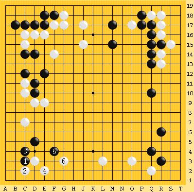 第1図私の白番です。 どうしましょうか?第2図 実戦の進行1白3は黒6の所です。ここはシノギましたが・・第3図 実戦の進行2外側の黒をからみ攻めに行ったら、黒は左上隅を捨てて中央の白を取りにきました。なんとかしのいで勝つことができました。第4図 補足説明1右辺に白の一眼があります。潰しに行こうとすると白6で渡ってしまうのです。第5図 補足説明2ゆえに黒は中央の白の眼を潰しにきましたが・・白は脱出できてしまうため黒は投了せざるを得ません。