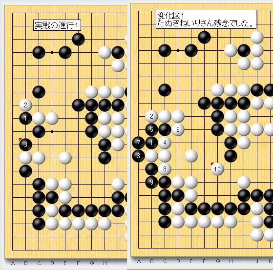 「投稿テスト 」の問題を放置しておりました。失礼しました。図1実戦図1と変化図です。たぬきねいりさんの変化図1は惜しい。目のつけどころは正しかった。実戦図2敵さんはコウに活路を求めました。実戦図3下辺の大石が死んで勝負あり。思いがけない展開でした。