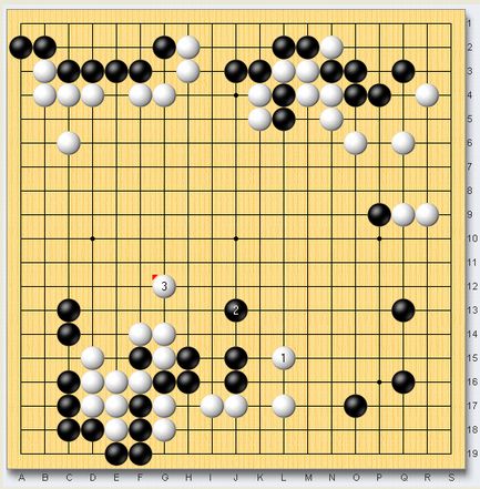 第1図 問題の局面三子の置き碁で私の白です。黒番で左辺をしのぐ手を考えて下さい。第2図 実戦の進行ま、これでも黒悪くないのですが・・第3図 終わっていたの図これをやられたら戦意喪失ですね。
