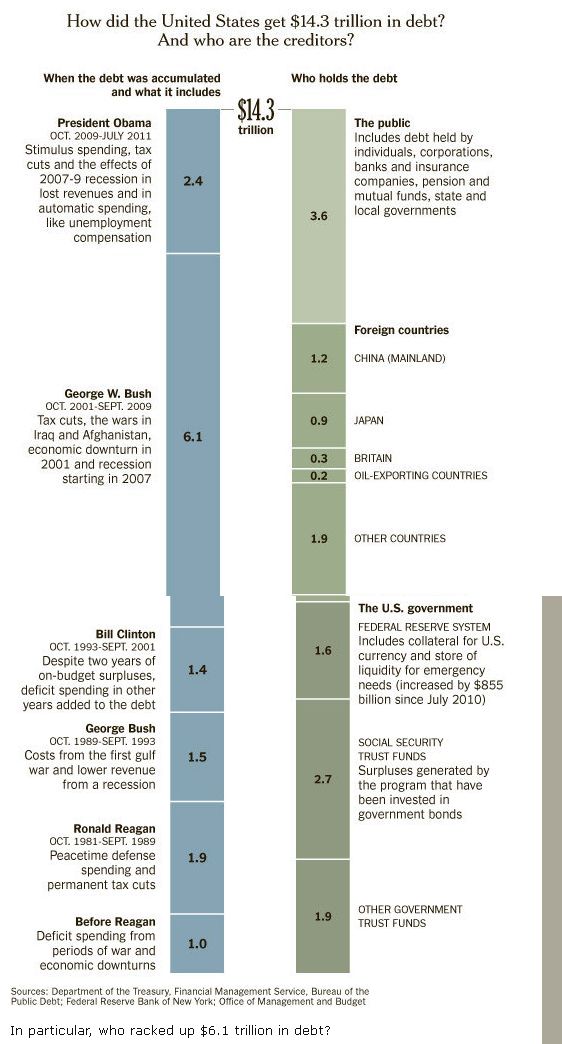 債務の上限が14.3兆ドルと定められている。これの上限を引き上げる法案が成立しないでもめている。下院は野党の共和党が多数を占めるねじれ状態にあります。2010年の中間選挙ではティーパーティ派という新人議員が大量に当選しました。その人たちが強固に反対しているらしい。で、14.3兆の債務は誰が作ったものか、どの大統領の時代に生じたものかをグラフの左側に表示し、右側には債権者が誰かを表示しています。左側オバマ(2009-2011) 2.4兆ドルブッシュ(2001-2009) 6.1兆ドルクリントン(1993-2001) 1.4兆ドルブッシュ(1989-1993) 1.5兆ドルレイガン(1981-1989) 1.9兆ドルその以前 1.0兆ドル右側銀行・地方自治体・投資信託など 3.6兆ドル中国 1.2兆ドル日本 0.9兆ドルイギリス 0.3兆ドル産油国 0.2兆ドルその他 1.9兆ドルFRB買い入れ 1.6兆ドル社会保険基金 2.7兆ドルその他政府機関 1.9兆ドルこれを見ての感想○ブッシュが6.1兆ドルも増やしたんだろ!共和党ががたがた言うな!○債務の半分近くは両建てじゃないの?株を公開している民間企業では関連企業間の取引を内部取引として除外した連結財務諸表を公表する義務があります。債務者がアメリカ政府、債権者もアメリカ政府の場合、民間の常識ではそれは除外した数字を公表すべきなのです。日本でも財務省が国の借金900兆円で増税しないといけないとかいうけど、資産はどうなんですかというデータが公表されていません。まだアメリカの方がこういう数字が出ているだけマシです。