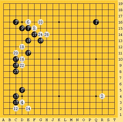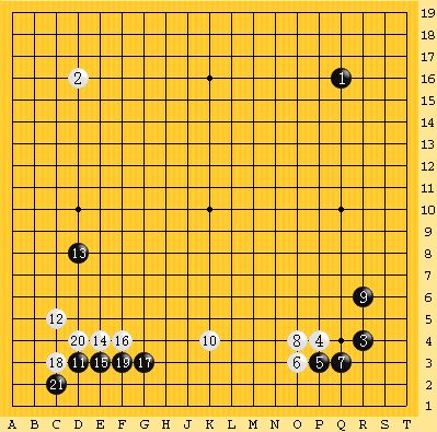 私の実戦、黒番である。上の図、白20のツギは変だ。一路左にボウツギするのが普通だ。私は黒21とハネた時、ラッキーと思っていた・・が、それは勝手読みであった。下の図、白1の様子見がうまい。白3~5とコウを仕掛け黒6と抜いた時に白7のワリコミでコウダテする。黒8と受けたらもうコウダテがない。黒10のスベリに白11と抜いてコウを解消されてしまった。二つポン抜いて白が良さそうである。私は右下の定石がコウに弱い形だとは知らなかった。最頻出の基本定石を理解していなかったことに愕然とした。