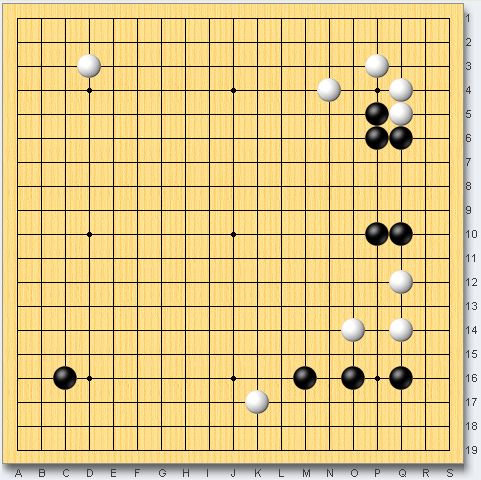 東洋囲碁で2Kの方の碁です。○上の図、黒番です。どこへ打ちましょうか?○中の図、これが実戦の進行です。黒は右辺の白三子を攻めたいので下辺にモタレて攻めようとしました。しかし、これが大いに悪いのです。○下の図、これが私ならこう打つの図です。右辺を狙うならば下辺を攻めるのです。弱い石が二つある場合、魅力のない方から攻めます。下辺と右下の自分の地を固めてゆきます。取れなくても損をしないようにしましょう。