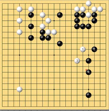 私の黒番です。地合いは大差でリードしています。取られさえしなければ勝ち、です。中央の石もまだ活きていませんが、まずは左辺をしのがないといけません。次の一手は?答え、黒1のワリコミが筋です。白2で左右どちらからアテても取られていることを確認ください。白2のグズミしかありません。そこで再度、黒3のワリコミが決め手です。活きていることを確認ください。