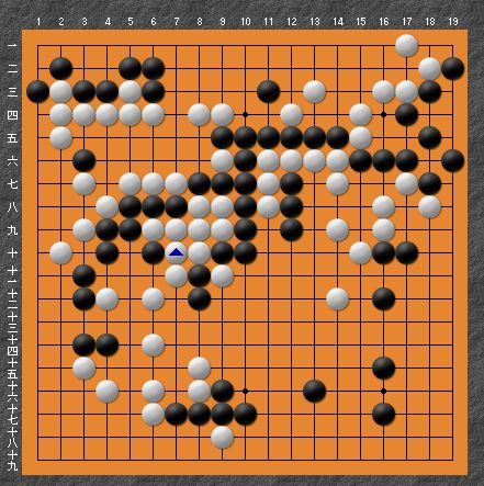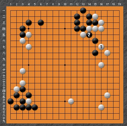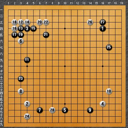 実戦の進行1私の白です。ヘタな序盤です。とくに白22はまずかった。参考図1白1のツメが急務でした。黒2とタタかれても辛抱しましょう実戦の進行2黒9と15はハネるべきでした。ラッキーしました。実戦の進行3白11までの局面。ここで黒はどう打ちますか?実戦の進行4ここで黒は間違えた、形勢を損じたと思います。参考図2こう打っていれば黒優勢だったと思います。実戦の進行5実戦の進行6こんな所が白地に化けては勝ちです。