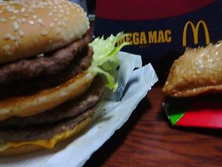 やっぱり食べてしまった…マクドナルドのメガマック こういうネタもんにはめっぽう弱い我が家なもんで。普通にセットで食べてホットアップルパイまで食べましたが、何か?しかも昨日風邪で38度4分の熱出してダウンしてたはずのだんなぼんも、リハビリと称して一緒に食べてた。…どんな家だ。ま、この手のものにありがちな問題点として、当然食べにくいのでオススメはしないかも。何て言ってもカロリーはこれ単品で754kcalだそうなので、ネタじゃなけりゃカツ丼食いますわ。