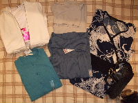 バタバタしていて先日購入していた福袋のネタバレが遅くなりました…ごめんなさい何しろフォトが…どうしてもうまく撮れませんでした。相変わらずヘタです。ごめんなさい…さて無敵の美人さん「12点詰め込みひな袋」です。予定通り、10日に到着。中身は何かしらん。まず一着目。カラシ色のワンピ。う~ん、デザインは好きだけど、この色は着こなせそうに無いなぁ…。このライムグリーンは昭和のかほりが…かわいいピンクの半そでストライプシャツだけど、年相応じゃ無し。無敵の美人さんのいちおしアイテム、あまえんぼ袖のタートルネックですね。お色は深緑。これは使えそう!グレーのシンプルタートルリブニット。袖がかわいい!!使えそう。白のサマーニットアンサンブル。キャミソールと半袖カーデの組み合わせ。かざり襟とりぼんは水玉のシフォン。これも使える。これは特にうまく撮れなかった。シンプルな黒のタンクトップ。ヘビロテ確実。グレーの半袖カットソー。これも大いに活躍予感。白のカプリパンツ。薄くて安っぽくはあるが、白だし夏使うのでオッケー。(下着は要注意)ラメ入りチャコールグレーのくしゅレギンス。テロテロなストレッチ素材で、かざりボタン付き。今からどんどん使えそう。これ、かわいい!!胸から上はサマーニットの黒。小さなリボン付き。スカート部分はシフォン素材で花柄。ちなみに上部の拡大がこちら。最後にアクセ。昔クラブの天井で回っていたような玉色に輝くボールを連想…黒いけど虹色に輝きます。う~ん、母世代のおしゃれ着に合いそうだわ。結果は12点中8点はオッケー残りはリサイクル決定となりました(上3点とアクセ)今回の福袋は個人的には70点くらいでした。まあまあ…かな