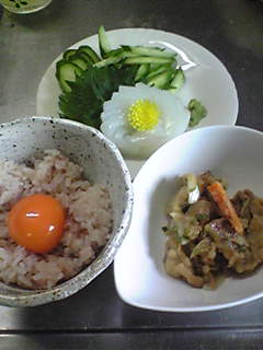 美味しい美味しい卵が手に入ったので大好きな卵かけごはんにしました “ねはんの里HP”よりお取り寄せの卵かけごはん黄身が濃いー(´∀`●)こっくりと甘くて美味しかったです。卵白は見たことないくらいもりもりと盛り上がっていました(携帯変えたら、ブログへの写真の送り方がわからなくなったので“ねはんの里”さんのブログを見てね^-^;♪タハハ・・・)この卵白の盛り上がりすごいでしょう わたしは、卵かけごはんには卵黄しか使わないので、卵白は、タッパーに入れて保存しほかの料理に使います。この卵ちゃんが届いてから、毎日卵かけごはんをいただいているので、すでに4個分の卵白が待機中。クッキーなど、お菓子作りに使おうかなと思ってます イカ刺身揚げレンコンの南蛮漬け レンコンを縦に一口大に切り小麦粉と塩と水で作った衣にくぐらせて揚げたものを、酢醤油に浸ける。レンコン縦に切ると食感がさくさくしておもしろいんですよ柔らかいので、入れ歯のおばあちゃんも食べやすいみたいです