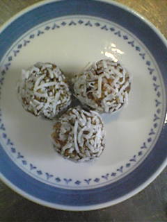 以前、鍋焼きパン教室をやったときコニタンが作ってきてくれたローフードチョコの作り方を聞いたので、私も作ってみました なっにぃ~コレ~~~~~~めっちゃめちゃめちゃ美味しい チョコレートじゃないのにチョコいや・・チョコより美味しい あまりの美味しさに感動 ナッツ類・ココアパウダー・レーズンorナツメ椰子、ハチミツorメープルシロップなどの甘味を適当に、 フードプロセッサーに投入し、ガーッと回して、コロコロに丸めてココナッツプードルをまぶし付けるだけ。 レーズンは全体量の1/3~1/2が適量で、レーズンの代わりにナツメ椰子、ハチミツの代わりにメープルシロップを入れるとリッチな味に。火を通さず食べれるので、私は酵素蜜を使いました 美味しすぎる~~~(o^^o)♪ナッツいっぱい使うので、私のおやつね 分量適当なのに・・美味しい~~~今日も1日がんばろう