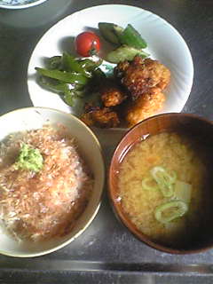 絶品わさび丼炊きたてごはんに鰹節、おろしワサビをのっけて醤油をたらり安曇野のワサビが手に入ったので♪かぼちゃと長ネギの味噌汁ワンプレートおかず ・ゲソのかき揚げ 瀬戸内海で獲れたゲソ(イカの足)・玉葱・人参・小麦粉・片栗粉・塩を フードプロセッサーでガーっと回して、油で揚げるだけ娘はおかわり連発、旦那にはお弁当に甘くて美味しいよー(´∀`●)♪ ・ピーマンのおかか和え ピーマン千切りにさっと塩して蒸し煮して、醤油回しかけておかかであえる。 ・キュウリの梅和え キュウリは乱切り。梅干しをたたいてあえる。 ・プチトマト あ~おいしかった!今日も1日がんばるぞ~