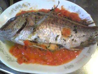 ご近所友達から釣ったばかりの鯛を一匹いただきましたかなり大きな鯛でピチピチ、しかも天然鯛刺身にしたら美味しいんだろうなぁぁぁぁしかし・・さばけない・・情けないワタシ・・で、丸ごとオーブンで焼くことにしました 鴨方町の美味しいランチのお店、“ビストロ ヴォナ村”のご主人に聞いたレシピです 真鯛に塩・こしょうし、タイム・オリーブ油を回しかけてオーブン200℃10~15分。竹串で刺して焼けているようなら取り出して、白ワインと水を足し、さらにオーブンで煮詰め、ザルで漉してから煮汁を鍋に移して、味を見ながら塩・こしょうする。あれば刻んだトマトを入れても美味しい。ポン酢で食べても美味しい。 この中の行程、ザルで漉す作業は省いたものの美味しくできあがりました “魚と云えば、煮付け、塩焼き”しか知らないバアちゃんに大ウケでした~