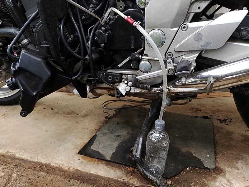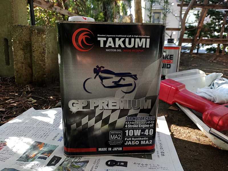 最後の整備はエンジンオイル交換です。今回使用するオイルはTAKUMI GP PREMIUM 10W-40です。100%化学合成油(HIVI)でありながら低価格ということで、初めて購入してみました。まだ走っていないので、レビューは出来ません。ここの管理人はスポーツ走行は全くしないので、高級オイルは必要ありません。オイルを排出している場面。ZZR号はドレンボルトが2か所あります。そのうちの1本が斜め後方に取り付いているため、いつもメインスタンドに注いでしまい、地べたにもオイルをまき散らしてしまいます。工夫しないといけませんね。