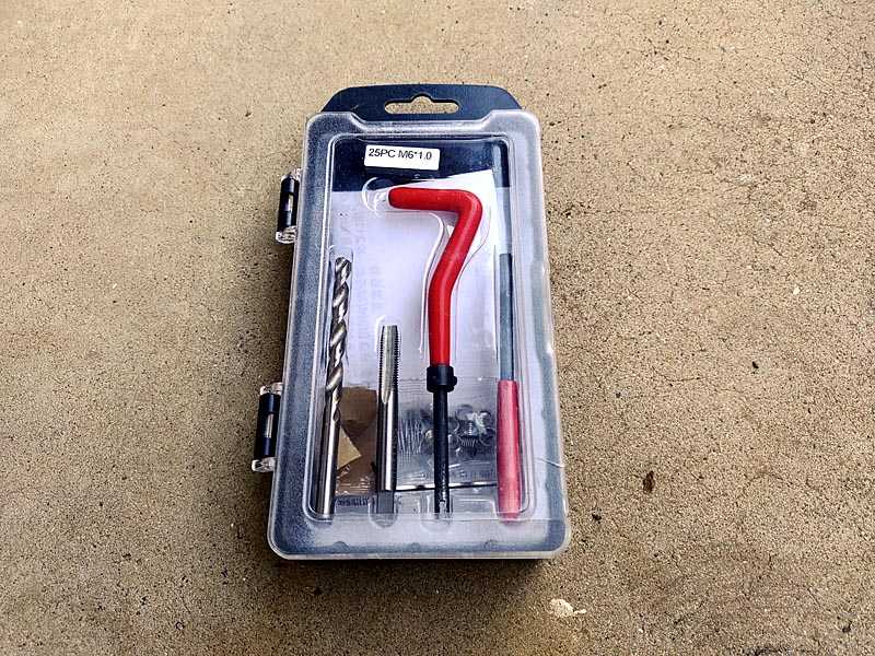 ZZR号のカウル取り付け用のボルト穴3カ所が損傷しておりまして、このほど、リコイルで修復を試みました。最初にボルト穴を損傷させてしまったのは18年前くらいで、そのころ、リコイルキットは各サイズが揃ったものしかなかった(存在したけど見つからなかった?)ので数万円もしました。このほど、ワンサイズだけのキットが売られているのを知ってさっそく購入してみました。幸運にも損傷させたボルト穴は全てM6なのでキットを一つ買えば全ての穴を修復できます。某通販サイトで購入したM6用のリコイルキットです。2000円弱でありました。タップハンドルは付いていないので持っていない方は別途購入が必要です。タップを切るのは遥か昔中学校の技術科でやったきりなので、緊張します。この作業は意外とスムーズにいきまして、問題だったのはコイルの挿入でした。上手く入っていかず、5本ほど無駄にしてしまいました。はい完成。3カ所とも上手くいきました。