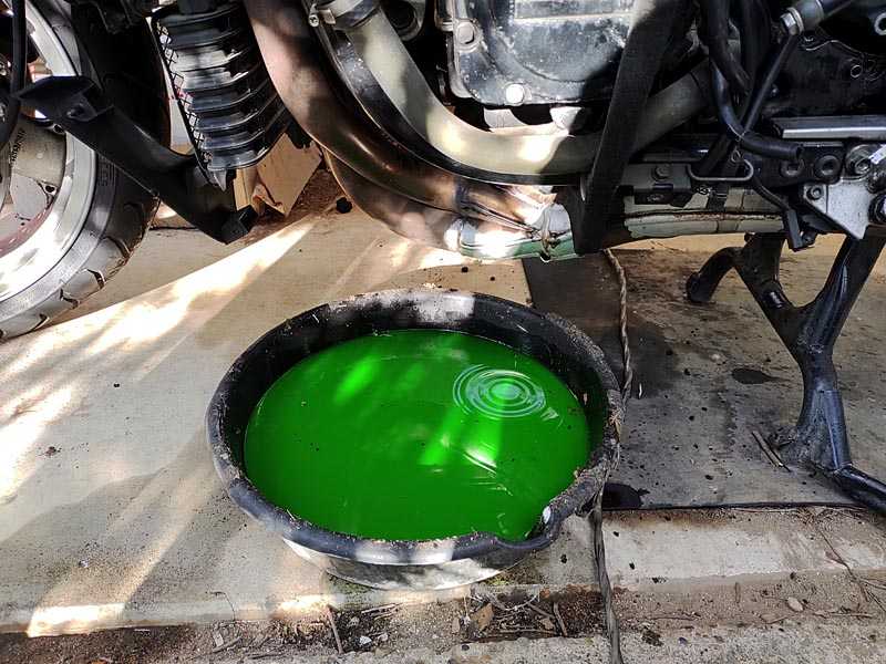 こちらも2年ごとの交換です。ラジエターホース交換の際に冷却水を抜いてしまってあるので、やらなくてはならない作業です。排出した冷却水。ZZR号の冷却水投入口はこんなところにあります。自作のジョウゴを使用しています。従来、希釈タイプのLLCを使用していたのですが、あまり販売してない上に値上がりしているので、そのまま使えるタイプを近所のホームセンターで購入しました。DCMブランドですが、製造元は古河薬品工業なので安心です。