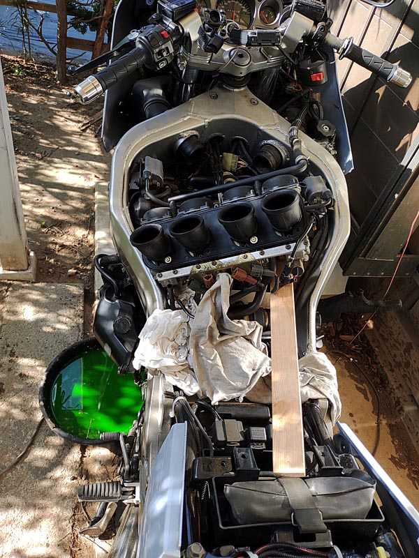 お次の整備はラジエターホースの交換です。4本あるラジエターホースのうち、今回はアッパーホースの1本を交換します。これがまた奥の方にあって、ガソリンタンク、エアクリーナーボックス、キャブレターまで外さないとアクセス出来ません。