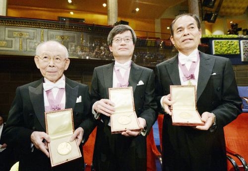 青色LED、輝く3氏 ノーベル賞の授賞式が10日行われ、青色発光ダイオード(LED)を発明した赤崎勇・名城大教授(85)天野浩・名古屋大教授(54)、中村修二・米カリフォルニア大サンタバーバラ校教授(60)はスウェーデン・ストックホルム市のコンサートホールで物理学賞を受賞した。