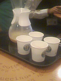 スタバで打ち合わせ、してたら。「サービスです」と、小さなコーヒー(甘い!)がでてきた、ガラス製のピッチャーのようなものの説明つきで。『この線まで氷を入れて。この線までコーヒーを入れると美味しいアイスコーヒーが・・」それって?イエモン水出し緑茶?をパクッテない?と突っ込み。「ええ、水出しコーヒーも大丈夫ですよ」と、軽くスルーされた。でも、スタバのサービスなんて、初めて!これって?大阪だけなん。
